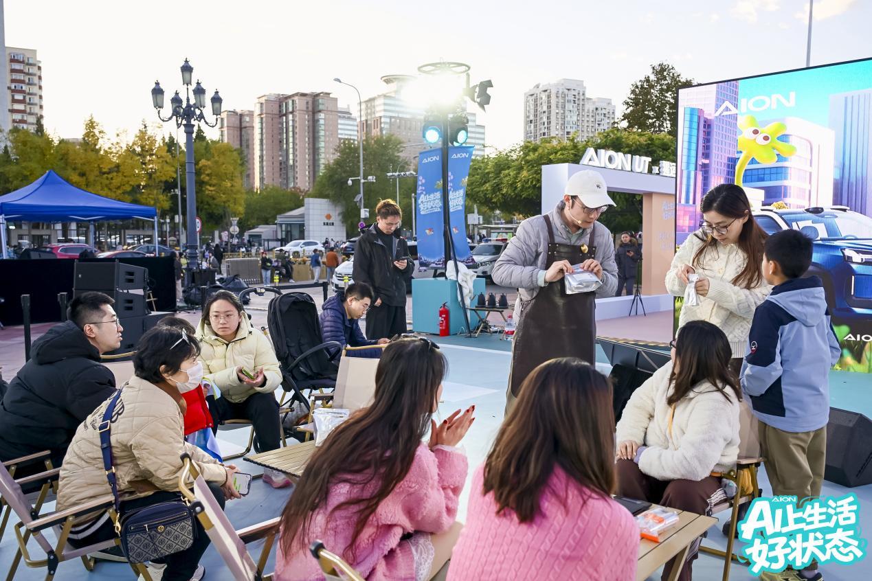 活动现场通过创新互动体验吸引了众多埃安用户和市民参与。如埃安UT车型化身运动空间,展现了紧凑车型的多元使用场景;埃安RT作为移动储能平台,其外放电功能满足了用户户外用电的需求;埃安霸王龙则成为亲子互动载体,现场开展的咖啡豆手工制作活动深受家庭用户欢迎。此外,全运会官方周边产品和优质车主集市商品也获得广泛关注,现场氛围热烈。