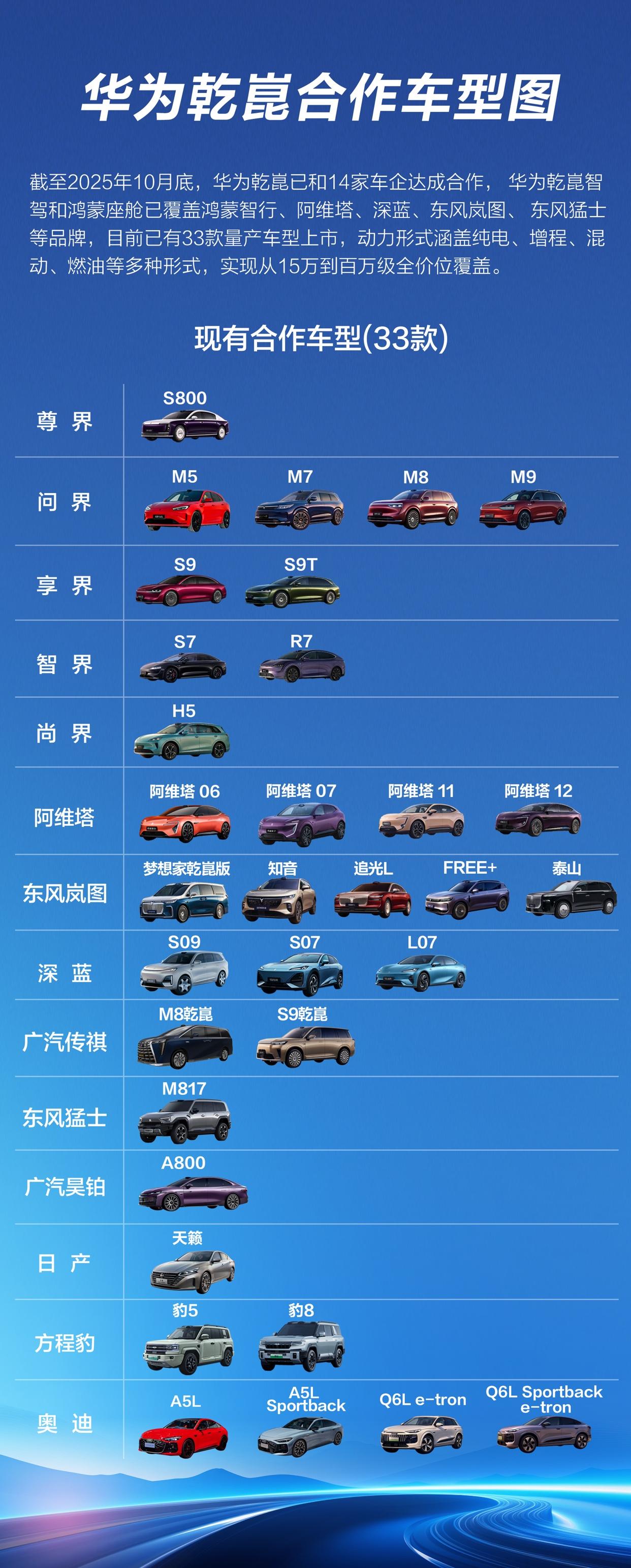 截至2025年10月底,华为乾昆已与14家车企达成合作,33款量产车型上市,覆盖鸿蒙智行、阿维塔、深蓝等多个品牌。