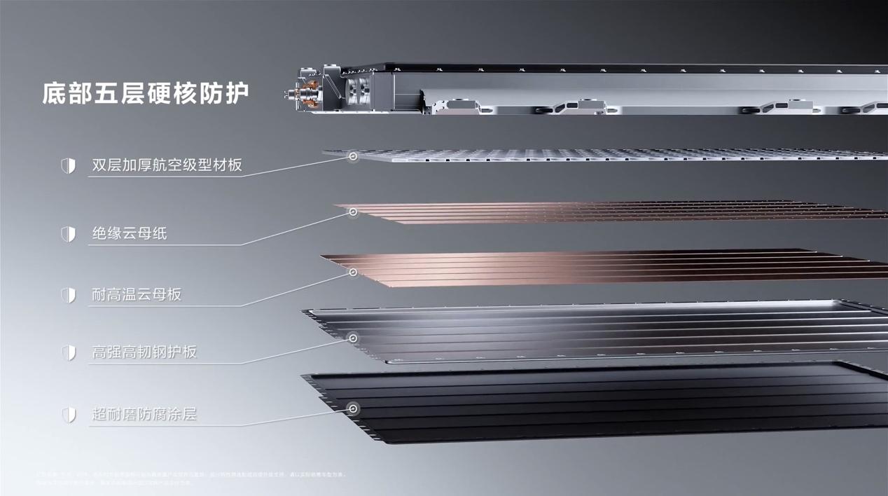 另一方面,在关键防护部位,平台则采取了『重防护』策略。电池包配备了全向防撞梁,侧边梁进行加厚处理,底部采用五层硬核防护结构,可有效抵御碰撞、托底、穿刺等机械冲击,降低电池包受损风险。官方表示,『该轻则轻、该重则重』的设计,并非简单的材料堆砌,而是基于大量场景模拟与数据测算的系统优化,最终实现了安全防护与整车操控、续航表现的平衡。