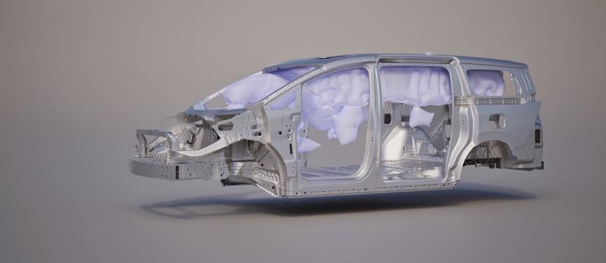 座舱内配备10个安全气囊,包括主驾膝部气囊与二排侧气囊,实现三排乘员的全面防护。