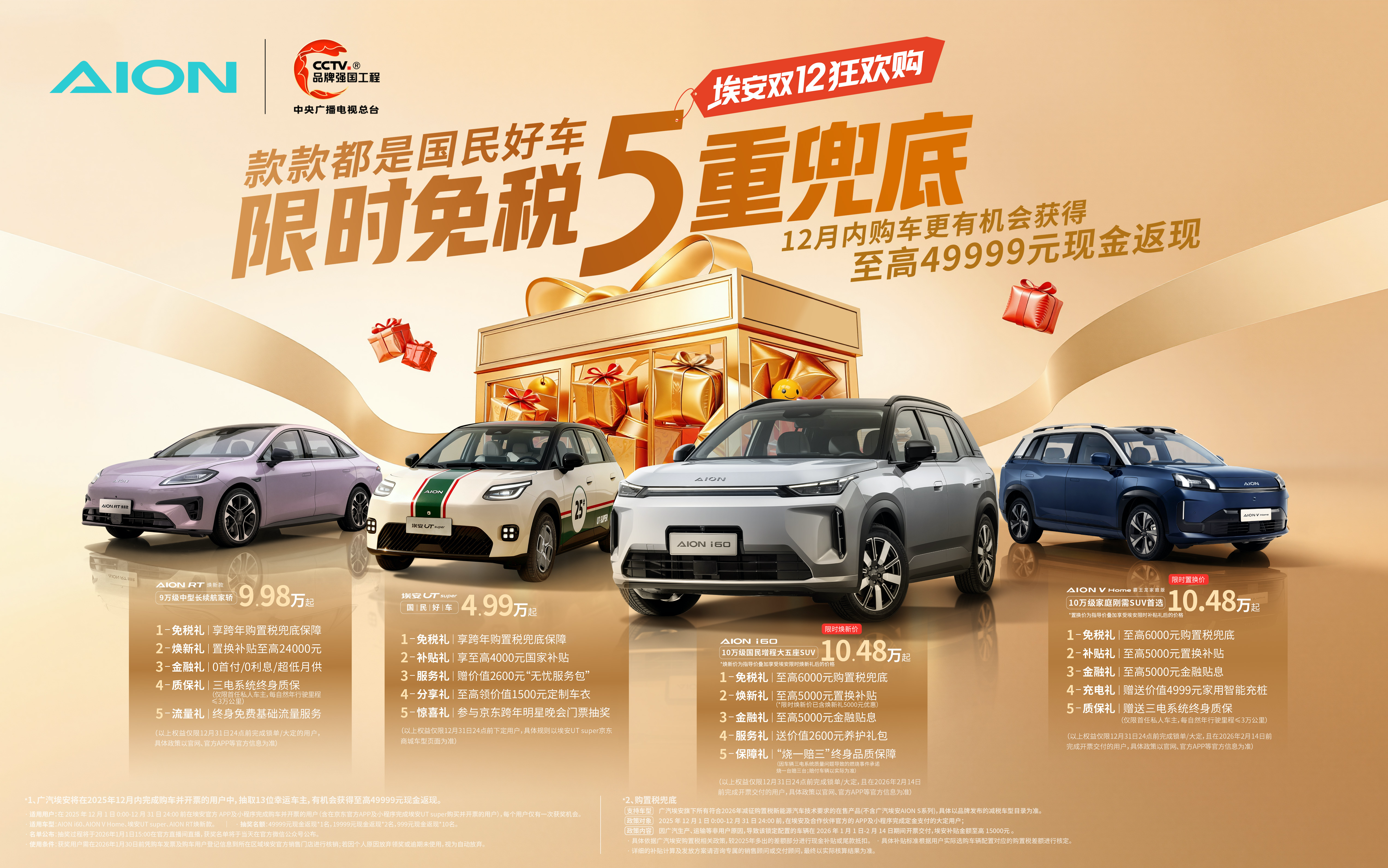新能源领军企业广汽埃安,率先启动“埃安双12狂欢购”,以高品质国民好车,叠加行业首个“限时免税5重兜底”,为消费者送上“定心丸”。不仅承诺购置税兜底、提供丰厚礼包,更有购车抢至高49999元现金返现超级福利,堪称年末不容错过的“抄底”良机,让家庭用户省钱省心把爱车开回家。