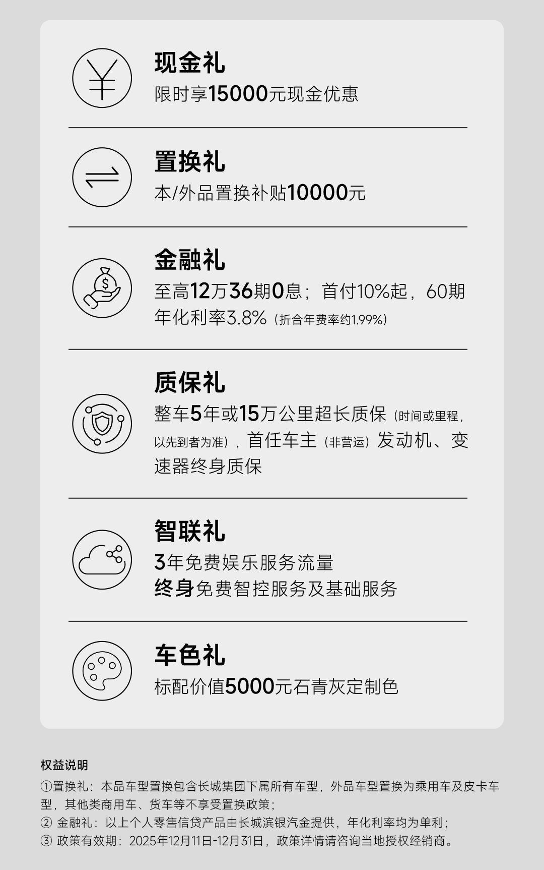 除了价格优惠,该车还推出了6重购车礼遇,进一步提升了产品的性价比。金融礼方面,用户可享受至高12万36期0息优惠,或首付10%起、60期年化利率3.8%(折合年费率约1.99%)的信贷方案,有效减轻了用户的购车资金压力;置换礼方面,本品车型(长城集团下属所有车型)置换与外品车型(乘用车及皮卡车型)置换均可享受10000元补贴;智联礼提供3年免费娱乐服务流量与终身免费智控服务及基础服务,满足用户日常用车的智能化需求;车色礼则标配价值5000元的石青灰定制色,为用户提供更多个性化选择。