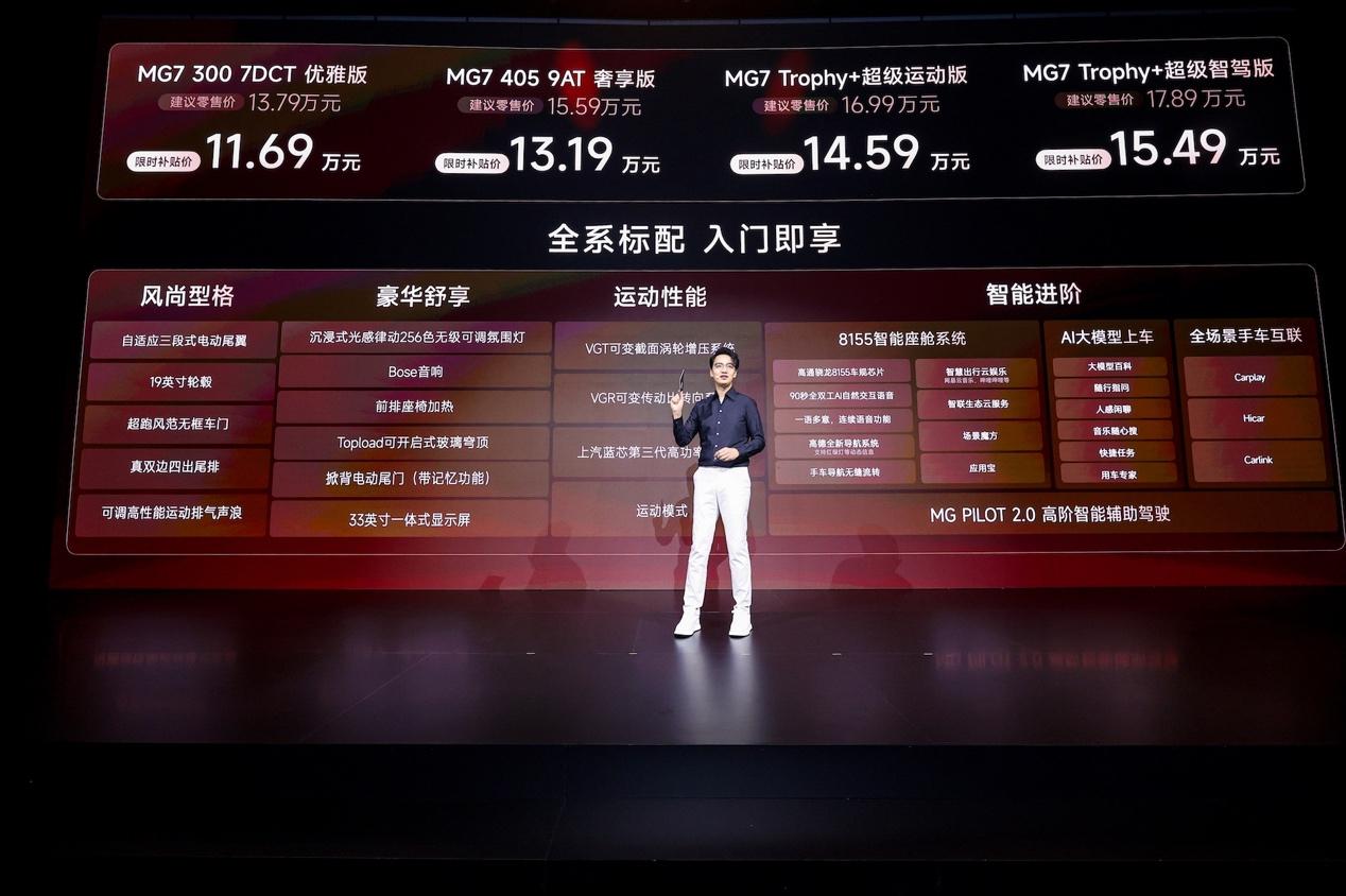 『技术平权』是MG在燃油车领域的核心价值主张,而MG7 2026款则成为这一理念的生动载体。新车推出4款车型,限时补贴价11.69万元-15.49万元,却将以往仅存于高端轿跑的配置全面覆盖全系车型,打破了『高端配置仅顶配专属』的行业惯例。