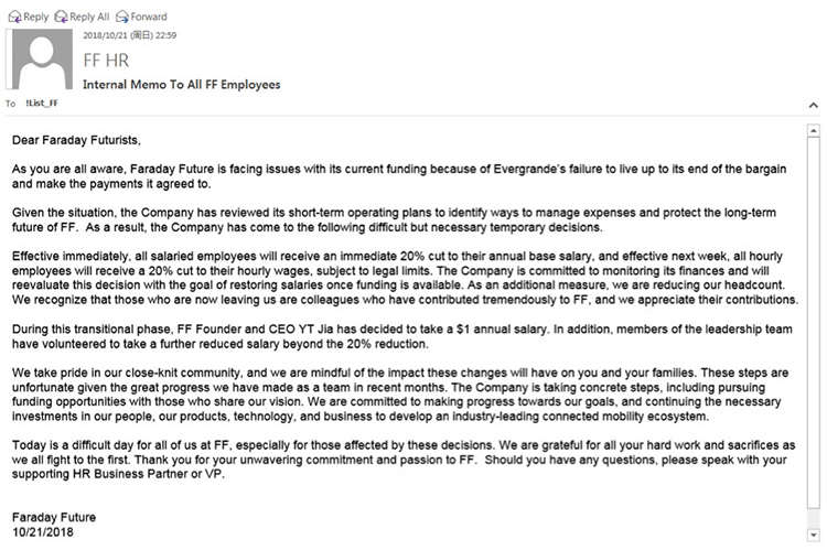 降薪20%并裁员 FF法拉第未来再次陷入资金困境